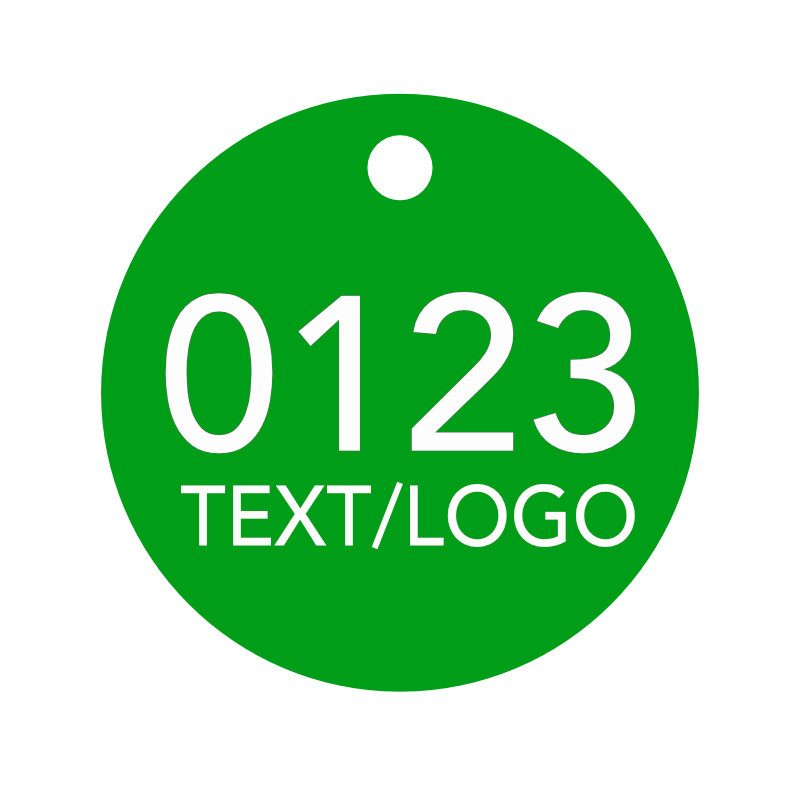 Baumnummern, Baumplaketten Ronde aus eloxiertem Aluminium, Durchmesser 35 mm, Stärke 1 mm. Die Plaketten verfügen über ein Befestigungsloch von ø 4 mm und sind in verschiedenen Farben erhältlich. Die Beschriftung erfolgt 2-zeilig, wahlweise mit fortl. Nummer oder Text / Logo durch Laserbeschriftung.